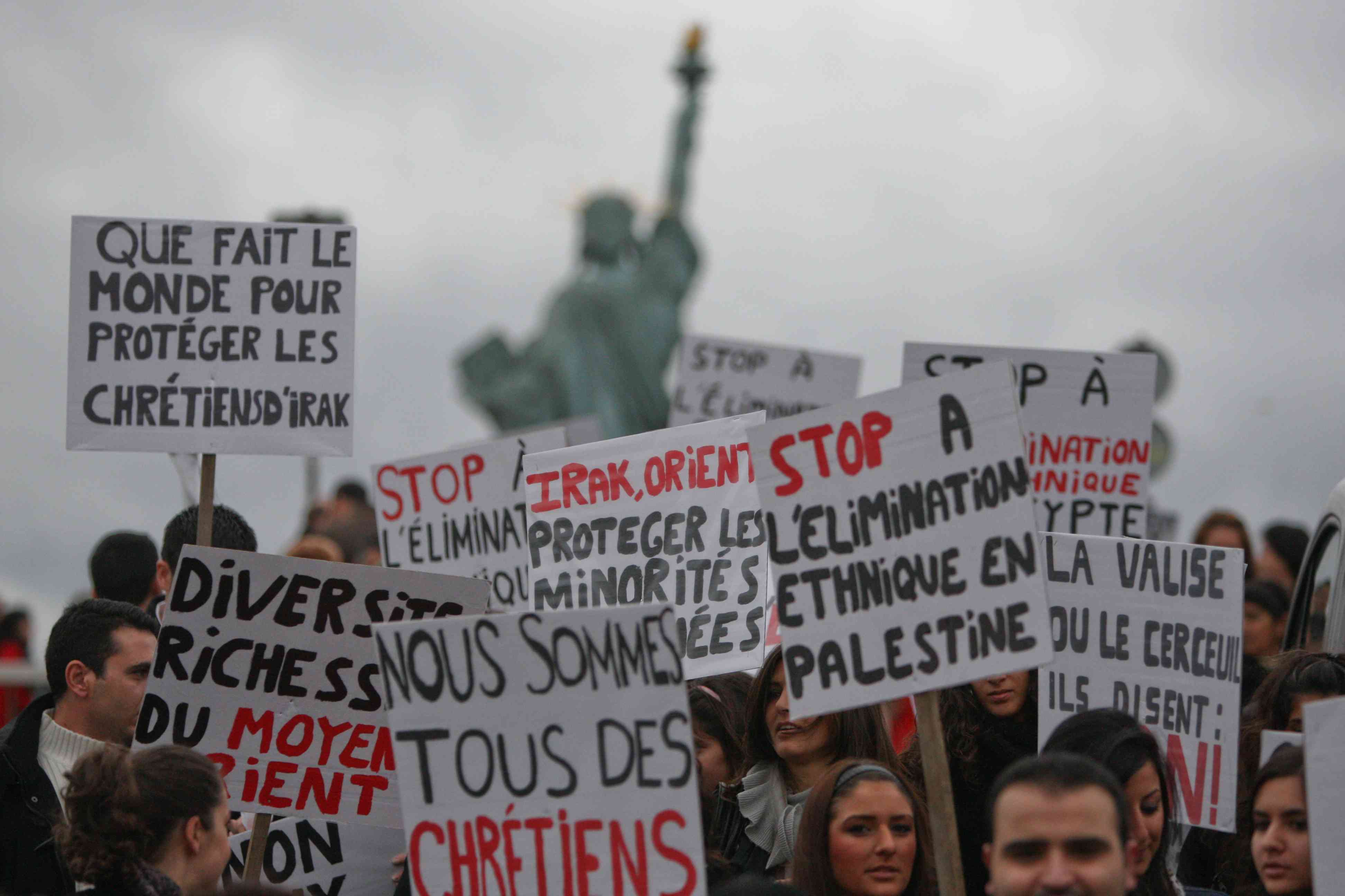 Cette manifestation, qui s’était donné rendez-vous au pied de la statue de la Liberté, sous le Pont de Grenelle, avant de rejoindre le Parvis des Droits de l’Homme, au Trocadéro, avait pour but de condamner fermement la prise d’otages sanglante perpétrée à l’encontre des chrétiens d’Irak le 31 octobre 2010 dans l’Eglise Syriaque Catholique Al-Najat de Bagdad, qui s’est soldé par la mort de 53 personnes et une soixantaine de blessés.